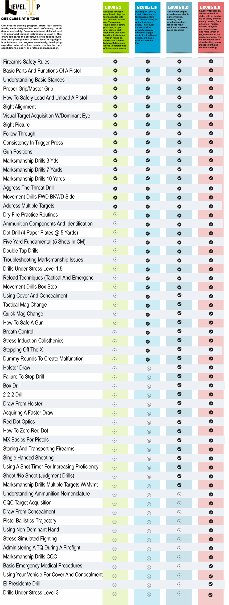 Comfortable workout clothes, water, and any required safety gear (if applicable). Firearms training may have additional requirements, which we will provide details for.